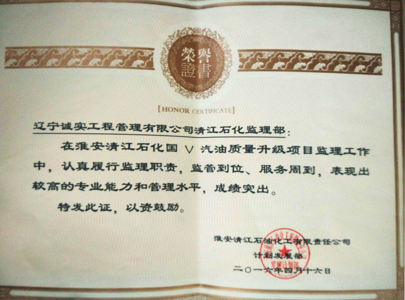 2016年淮安清江石化國V汽油質(zhì)量升級項(xiàng)目獎狀