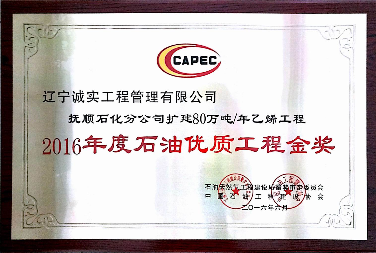 2016年石油優質工程金獎(撫順石化分公司擴建80萬噸/年乙烯工程)