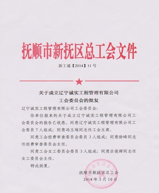 經(jīng)過近兩個(gè)月的籌備,誠實(shí)工會(huì)現(xiàn)已履行完畢各個(gè)籌備程序,撫順市新?lián)釁^(qū)總工會(huì)已正式批準(zhǔn)成立遼寧誠實(shí)工程管理有限公司工會(huì)委員會(huì)。公司工會(huì)由7名委員組成,下設(shè)經(jīng)費(fèi)審查委員會(huì)和女工委員會(huì)。公司工會(huì)將根據(jù)機(jī)關(guān)及項(xiàng)目部的實(shí)際情況,相應(yīng)成立工會(huì)分會(huì)和工會(huì)小組,發(fā)揮工會(huì)在企業(yè)中的積極作用,為企業(yè)的發(fā)展做出貢獻(xiàn)。