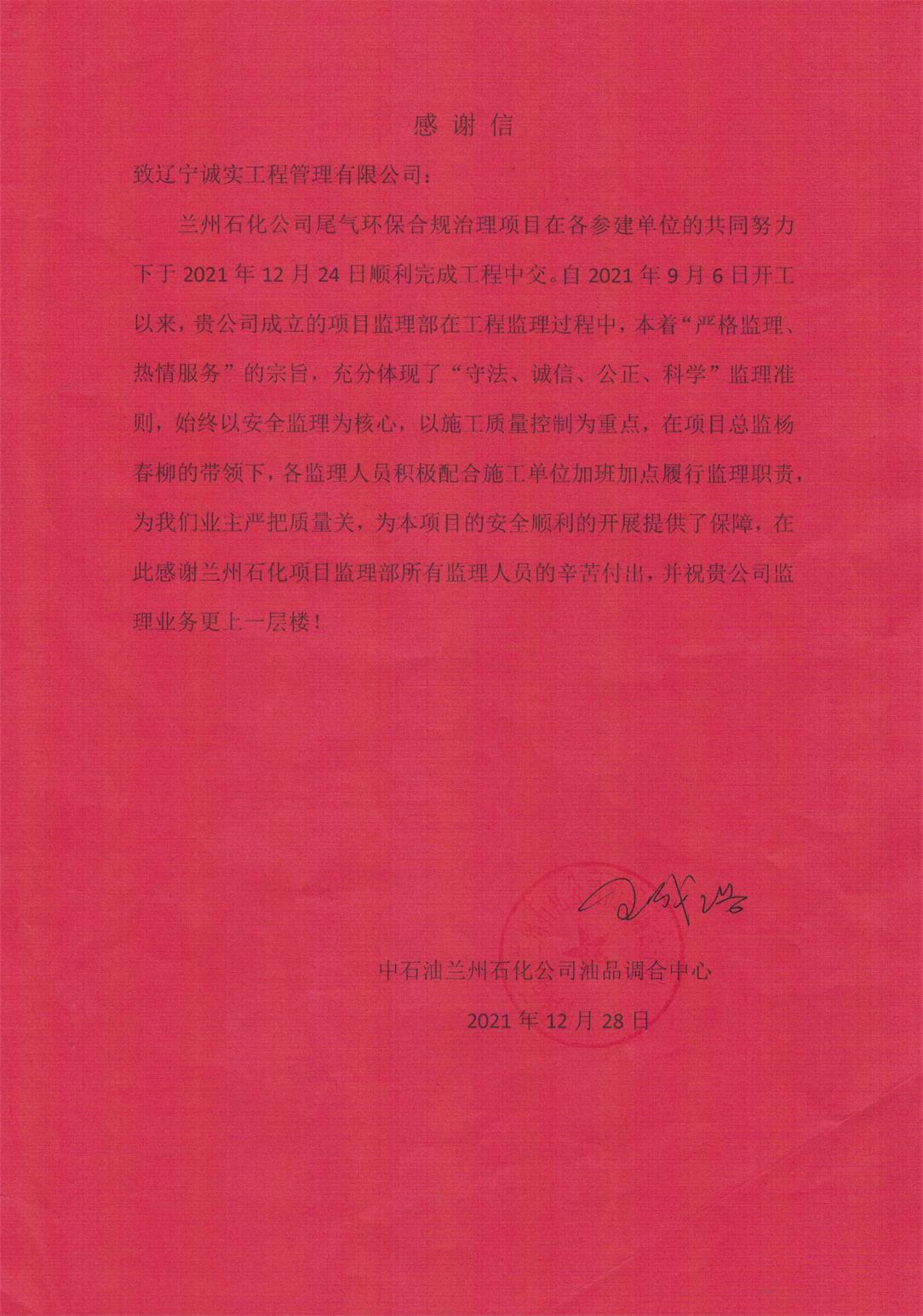 喜訊¦蘭州石化公司尾氣環(huán)保合規(guī)治理項(xiàng)目順利完成工程中交-項(xiàng)目部收到業(yè)主單位感謝信