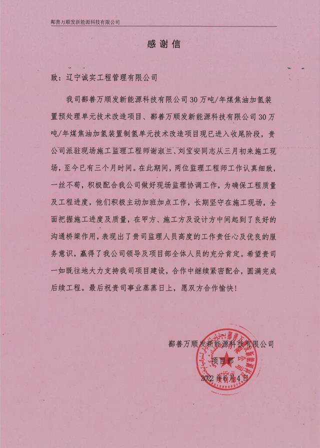 6月6日,公司新疆鄯善項(xiàng)目部收到業(yè)主單位的表揚(yáng)信。信中,業(yè)主言真意切地對我公司監(jiān)理人員在項(xiàng)目開展期間勤勉盡責(zé)的工作精神給予了高度的贊譽(yù)和充分的認(rèn)可。業(yè)主的表揚(yáng)是對公司綜合實(shí)力、服務(wù)質(zhì)量、技術(shù)水平的又一次肯定,誠實(shí)人必將以此為動(dòng)力,在嚴(yán)守安全底線、嚴(yán)把工程質(zhì)量大關(guān)的道路上砥礪前行!
