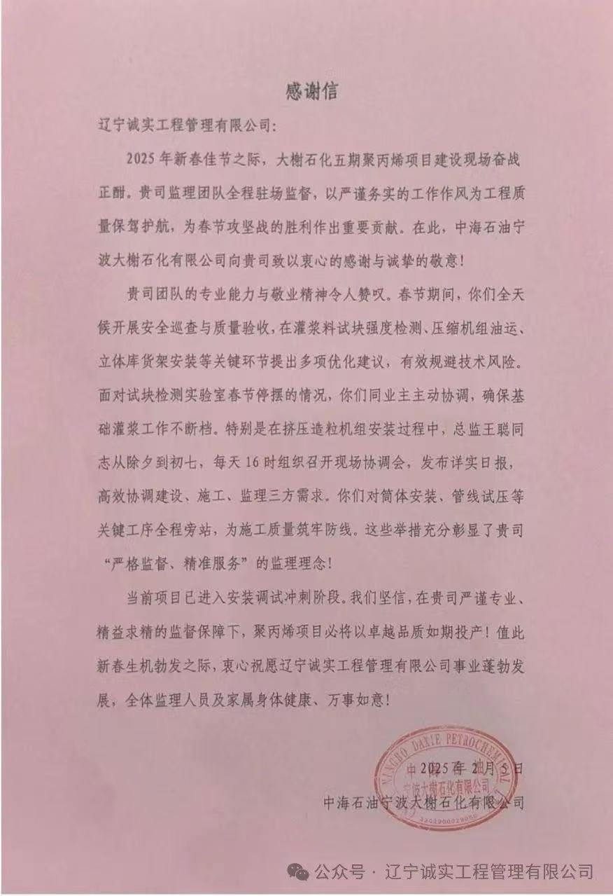 感謝信中提到:春節期間,項目部在王聰總監的帶領下共計10位同志全天候開展監理工作,確保項目平穩運行,彰顯出了誠實公司嚴格監督、精準服務監理理念。感謝信不僅是對項目團隊工作的高度認可,更是對于遼寧誠實公司整體實力和服務水平的肯定,以及對公司未來發展的期許和鼓舞。它激勵著每一位誠實人在今后的工作中續秉承專業、合作、公正、科學的服務理念,為廣大客戶們提供更加優質、專業的服務,共同推動行業的發展和進步!