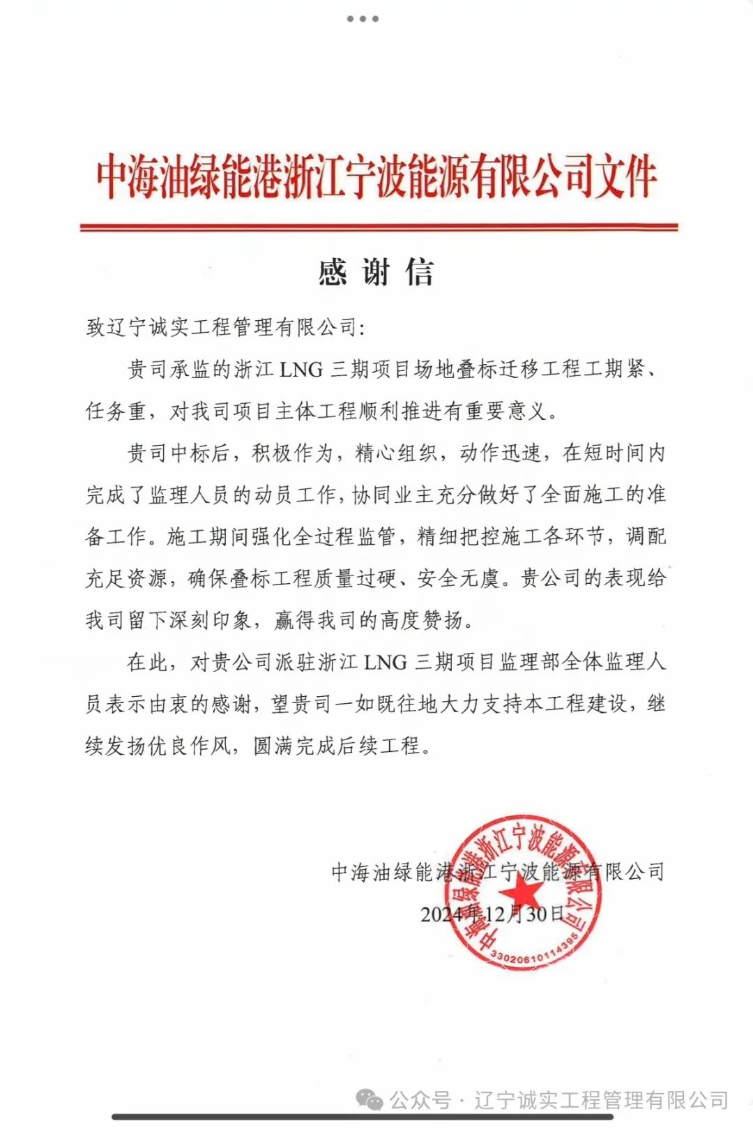 至此2025元旦來臨之際,浙江LNG三期項目場地疊標遷移項目部收獲來自于中海油綠能港浙江寧波能源有限公司發來的一封感謝信。